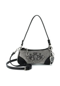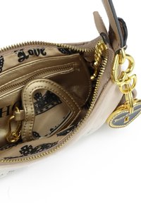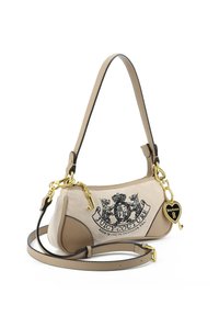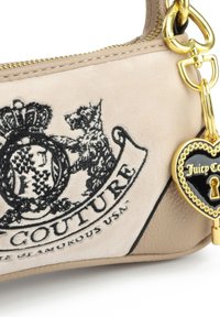 Kleine beige Juicy Couture-handtas met zwart geborduurd logo, gouden sleutel- en hartbedel, twee verstelbare riemen en ritssluiting.