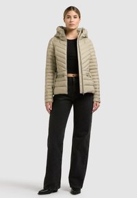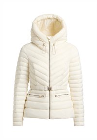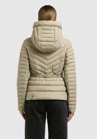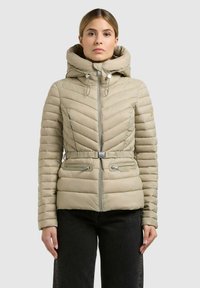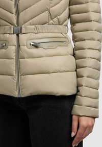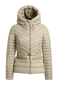 Vrouw draagt een lichtbeige doorgestikte gewatteerde jas met capuchon, riem en met rits afsluitbare zakken, gecombineerd met een zwarte broek, staand tegen een effen achtergrond.