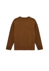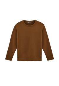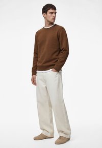 Jonge man die een bruin sweatshirt, witte wijde broek en beige schoenen draagt, staand met handen in de zakken tegen een effen achtergrond.