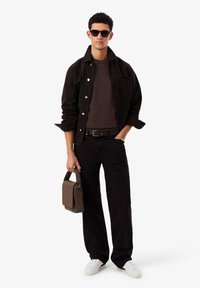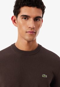 Man met kort krullend haar die een donkerbruin sweater met ronde hals draagt met een klein groen krokodillenlogo, staand tegen een witte achtergrond.