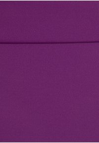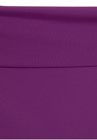 Paarse tweedelige bikini met een textuur bandeau-top met brede bandjes en een hooggesneden onderstuk. Glad materiaal, minimaal ontwerp.