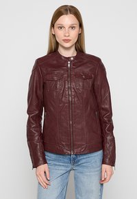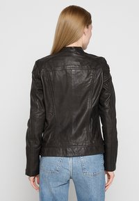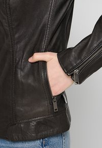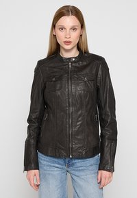 Zwarte leren jasje met opstaande kraag, rits aan de voorkant, twee borstzakken en ritssluitingen bij de mouwen. Zachte textuur en getailleerd ontwerp.