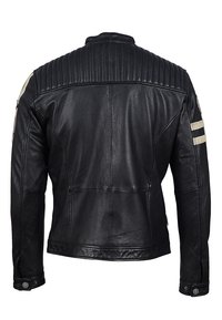 Zwarte leren jas met ritszakken, schouderpadding en decoratieve patches. Accenten met beige strepen op de mouwen.