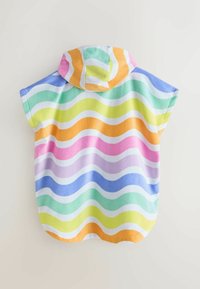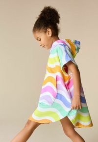 Jong kind dat een kleurrijke hooded towel poncho draagt met golvende strepen in oranje, roze, groen en blauw tegen een effen beige achtergrond.