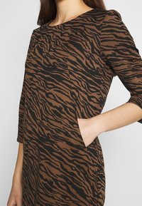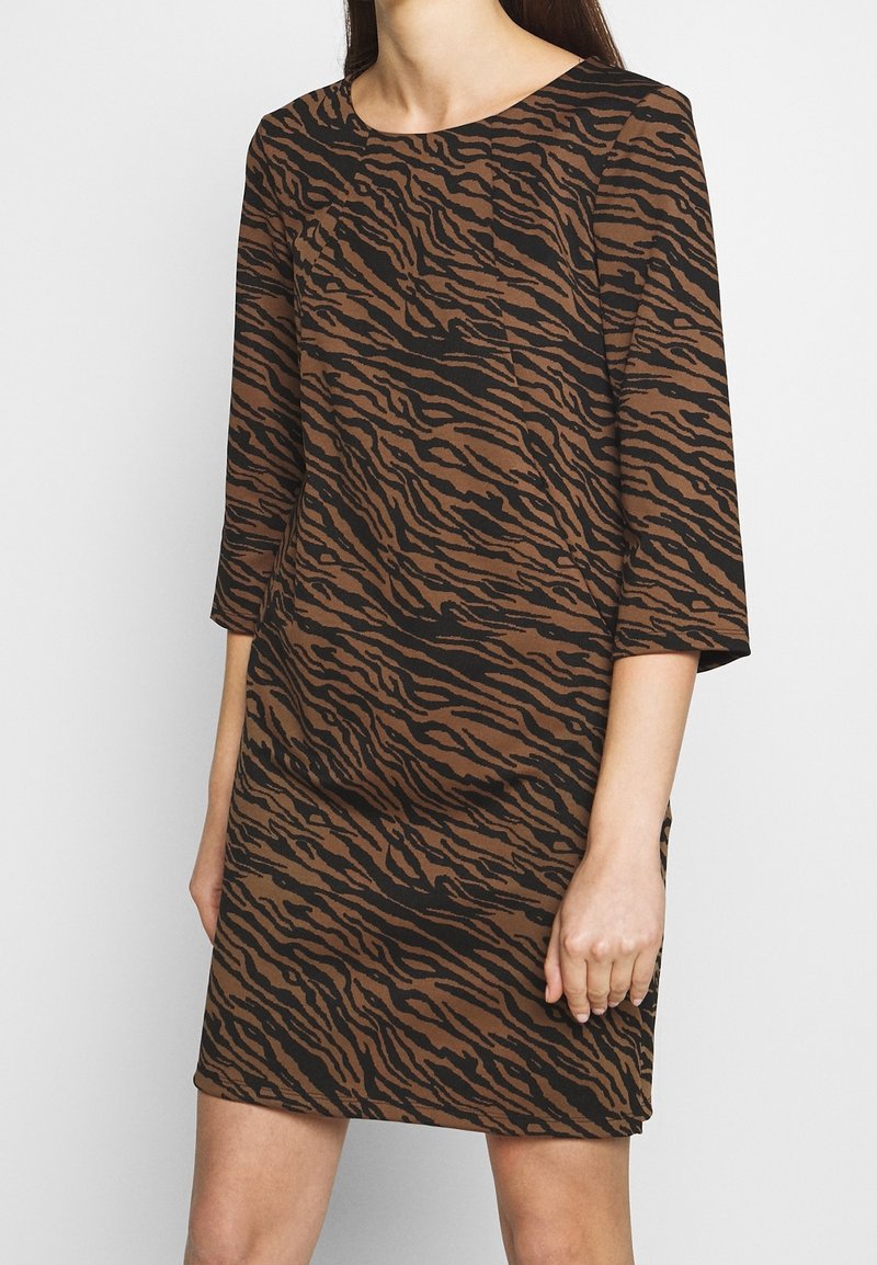 Vrouw draagt een bruine en zwarte tijgergestreepte jurk met driekwartmouwen en een ronde hals, staand tegen een witte achtergrond.