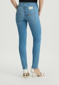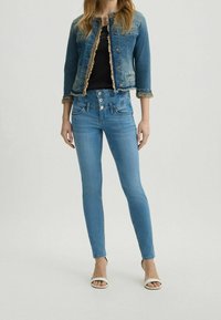 Lichtblauwe high-waisted skinny jeans met vijf zakken, decoratieve stiksels en een knoopsluiting. Draag het met witte hakken sandalen.