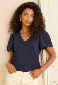 Twee dames tops met korte mouwen, één effen marineblauw en één wit met marineblauwe strepen, beide met gegolfde V-hals en mouwranden.