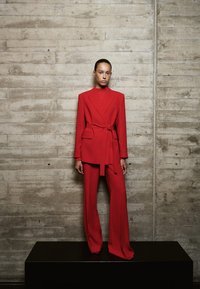 Vrouw die een opvallend rood op maat gemaakt pak draagt met een blazer met ceintuur en wijde broekspijpen, staand tegen een eenvoudige lichte achtergrond.