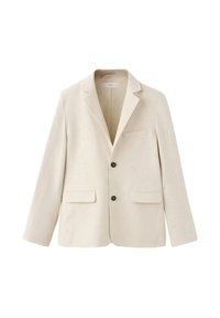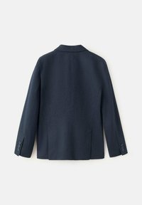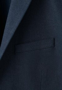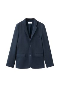 Marineblauwe herenblazer met twee knopen aan de voorkant, twee klepzakken, een borstzak met bies en een notched kraag.