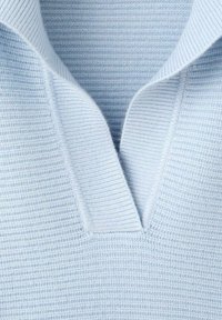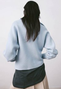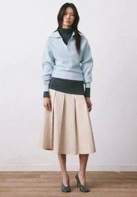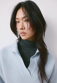 Vrouw met lang donker haar, gekleed in een lichtblauwe trui over een donkere coltrui en een beige geplooide rok, staand met gekruiste armen.