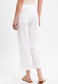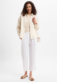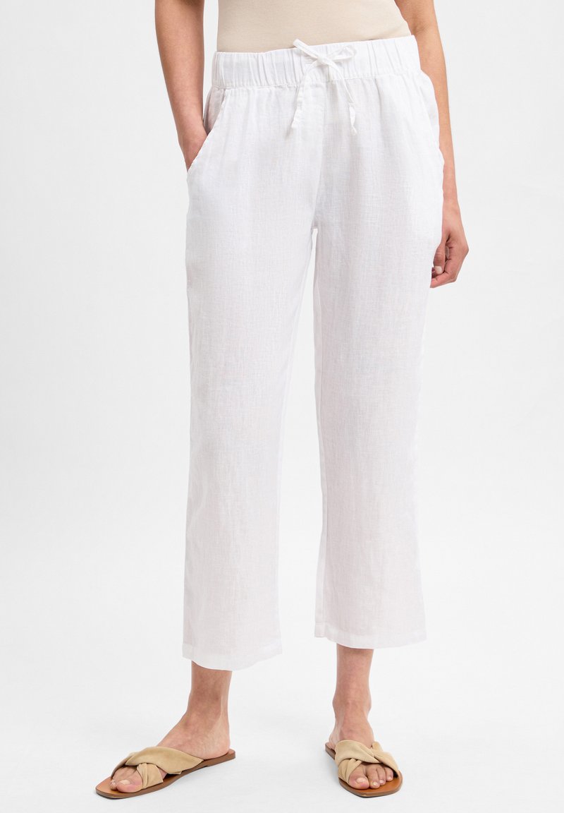 Witte linnen broeken met een ontspannen pasvorm, elastische tailleband met trekkoord, zijzakken en cropped lengte. Gepaard met beige slipper sandalen.