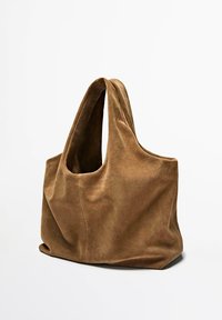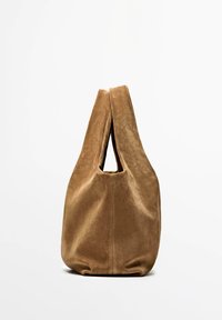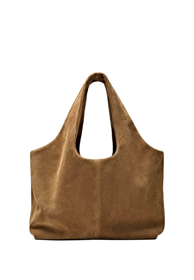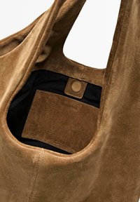 Twee hengsels en schouderbanden. Totebag. Magnetische drukknoopsluiting. Katoenen voering. Gemaakt van runderleer met splitsuède afwerking.