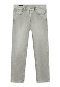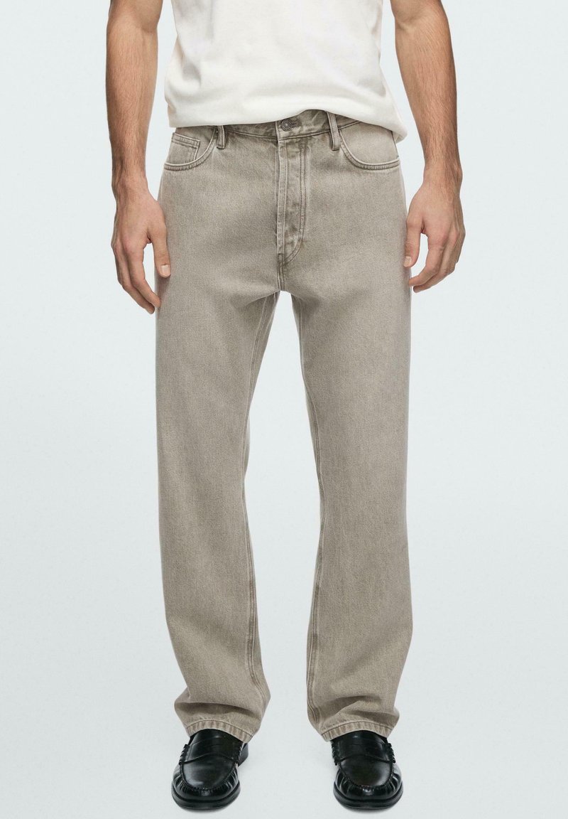 Man draagt lichtgrijze jeans met rechte pijpen, zwarte loafers en een wit overhemd, staand tegen een effen lichte achtergrond.