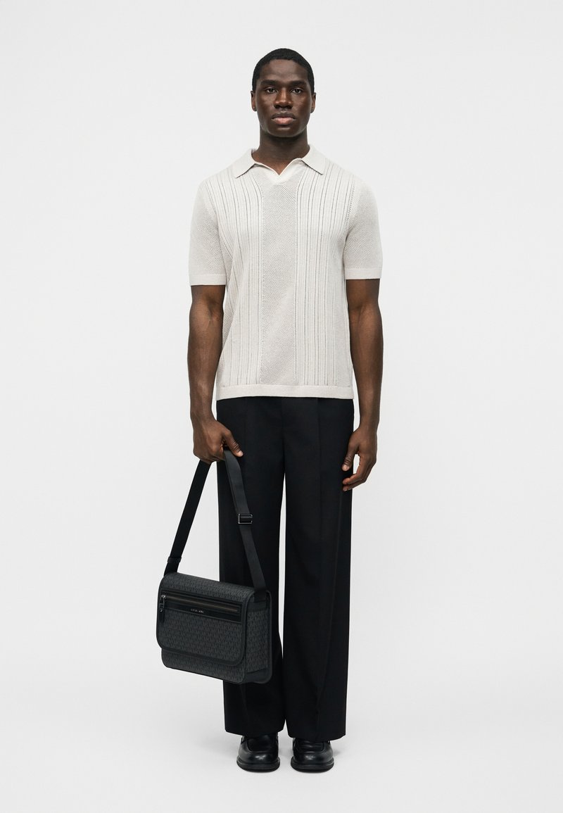Man draagt een witte polo met korte mouwen en textuur, zwarte broek met brede pijpen, zwarte schoenen, en houdt een zwarte schoudertas met patroon naast zich vast.