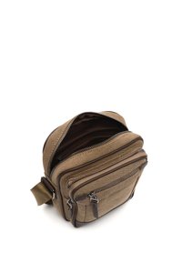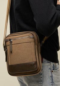 Jonge man met krullend haar die een zwarte trui, lichtblauwe spijkerbroek en een bruine crossbodytas draagt tegen een effen beige achtergrond.