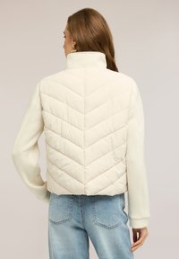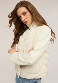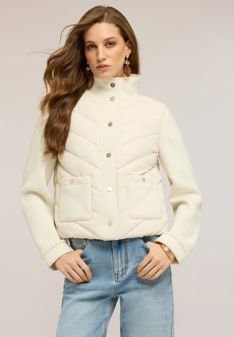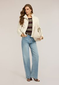 Vrouw met lang golvend haar, gekleed in een crèmekleurige doorgestikte jas met drukknopen, blauwe spijkerbroek, gouden armband en hangende oorbellen, poserend met handen in de zakken.