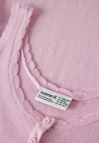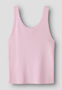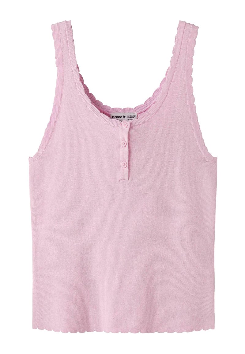 Lichtroze mouwloos gebreid topje met gegolfde randen en drie kleine knoopjes bij de halslijn.