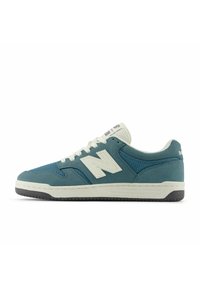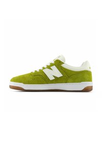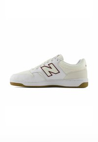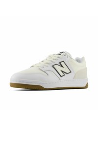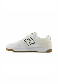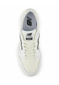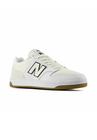 Witte lage sneaker met zwart "N"-logo, gumzool en veters aan de voorkant, zijaanzicht op een witte achtergrond.