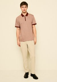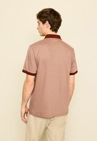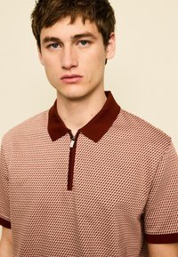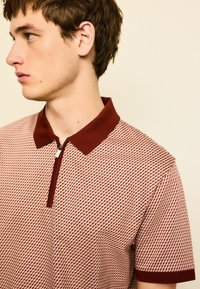 Kortärmelig bordeaux polo met patroon, een donkerrode kraag en een ritssluiting. Lichtgewicht stof met een gestructureerde afwerking.