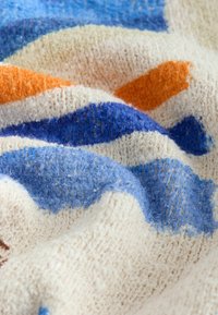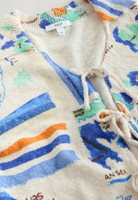 Korte mouwen gebreid vestje met strikjes aan de voorkant, met een kleurrijke wereldkaartprint in oranje, blauw, groen en beige tinten.
