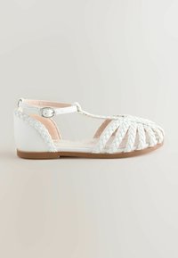 Witte gevlochten sandalen met een T-band ontwerp, platte zool en enkelgesp. Glad materiaal met een gesloten achterkant en open teenstijl.