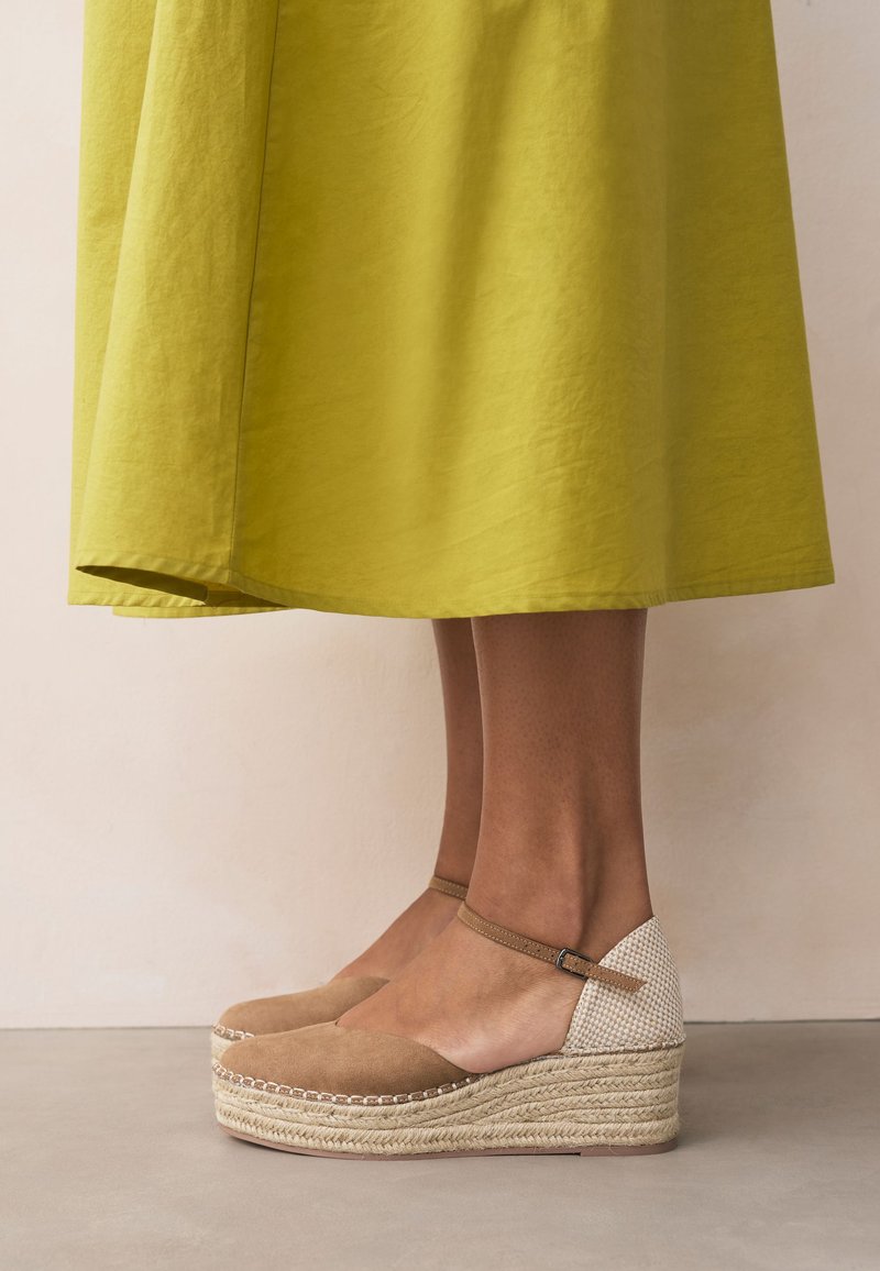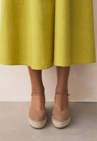 Beige espadrille sleehak schoenen met enkelbandjes gedragen bij een felgele rok tot op de knie op een neutrale vloer.