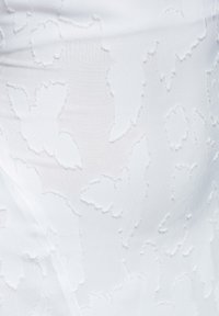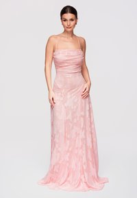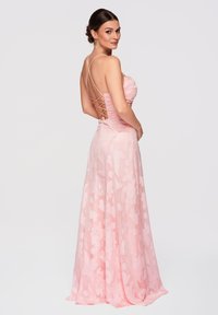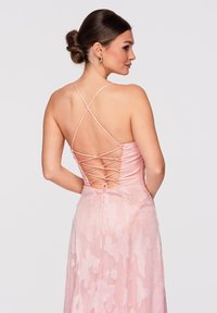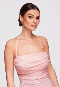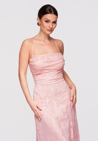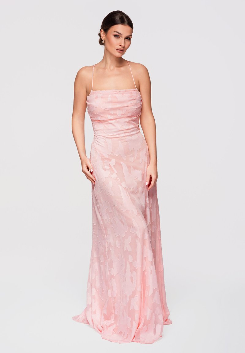 Vrouw met donker haar in een elegante, lichtroze spaghetti-strap avondjurk tot op de vloer met subtiele bloemmotieven op een witte achtergrond.