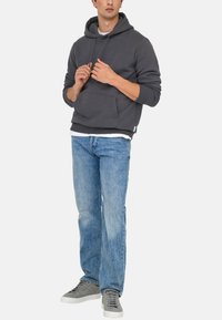 Man met een donkergrijze hoodie met trekkoordjes, een voorzak in kangoeroestijl, een wit ondershirt en een blauwe spijkerbroek, getoond van schouders tot heupen.