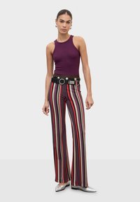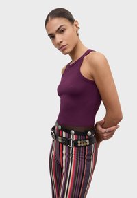 Glimlachende vrouw met haar naar achteren gebonden draagt een mouwloze paarse top en gestreepte broek met een zwarte riem voorzien van zilverkleurige studs en ringen.