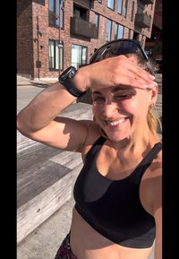 • Sportoutfit bestaande uit een zwarte langarmtop, kleurrijke bloemen short, zwarte compressieshorts en roze hardloopschoenen met witte sokken.
