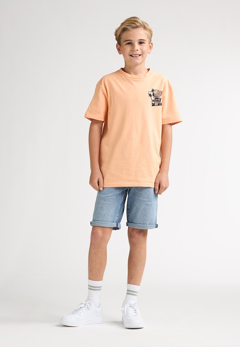 Perzikkleurig katoenen T-shirt met een grafische zakdetail, gecombineerd met gerolde denim shorts. Witte sneakers en gestreepte enkelsokken maken de look compleet.