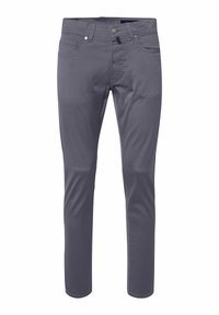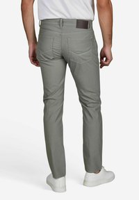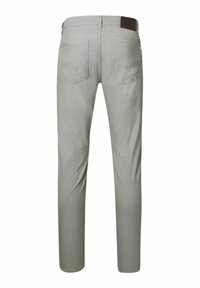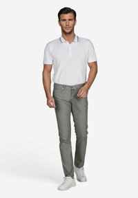 Man draagt strakke grijze broek met witte sneakers en een wit overhemd dat in de broek is gestopt, staand tegen een effen witte achtergrond.
