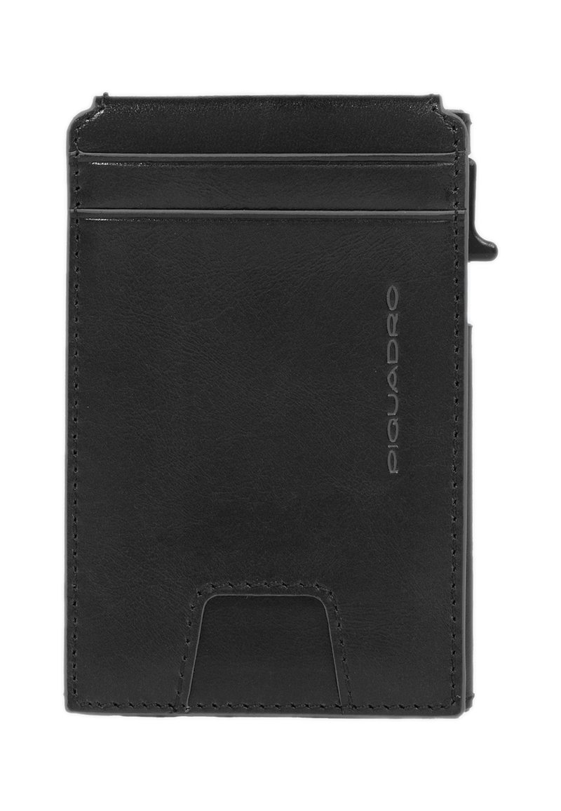 Zwarte slanke leren portemonnee met twee kaartsleuven, trekkoord aan de zijkant en merknaam "Piquadro" verticaal geperst.