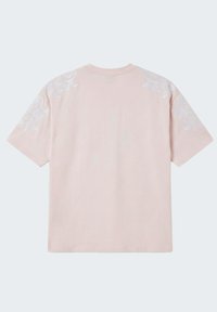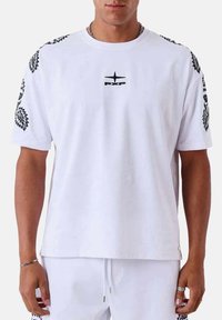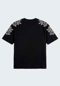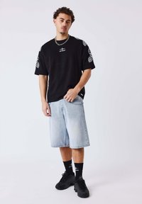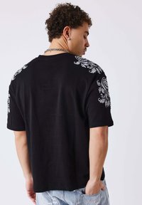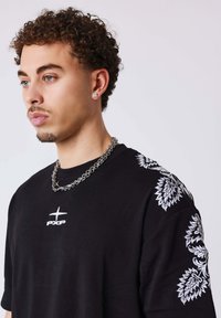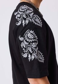 Man met krullend haar, gekleed in een zwart T-shirt met witte bloemenprints op de mouwen en een logo op de borst, lichtblauwe spijkerbroek en zilveren ketting.
