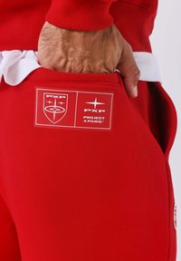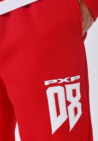 Persoon draagt rode joggingbroek met witte tekst "PXG 08" op de rechterdij, gecombineerd met witte sneakers en een rode trui.
