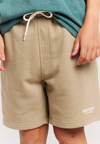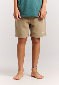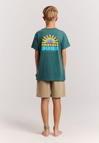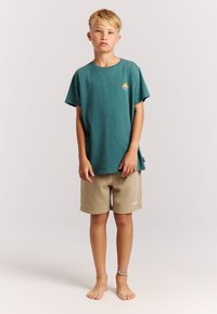 Blond jongetje staat op blote voeten, draagt een teal T-shirt met zonafbeelding en beige korte broek tegen een effen lichte achtergrond.