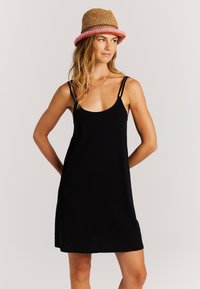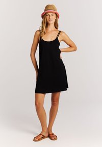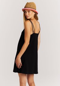 Vrouw draagt een zwarte mouwloze jurk met dubbele dunne bandjes en een bruine gevlochten hoed met een roze rand, kijkt opzij.