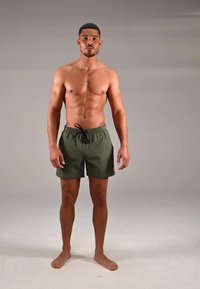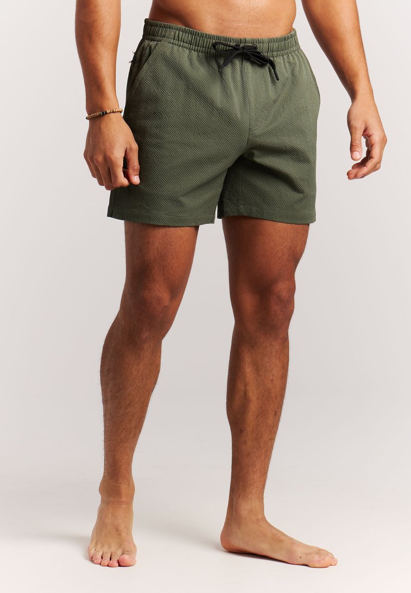 Man draagt olijfgroene zwemshorts met textuur en zwarte trekkoord, staat blootsvoets tegen een eenvoudige lichte achtergrond.