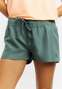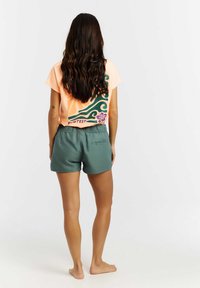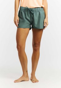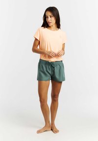 Vrouw draagt groene shorts met elastische taille en trekkoord, staat op blote voeten tegen een witte achtergrond, perzikkleurige top deels zichtbaar.