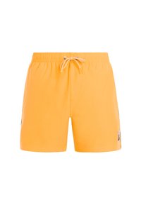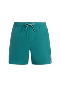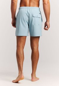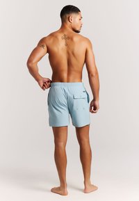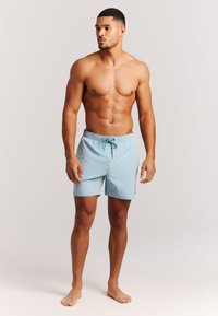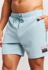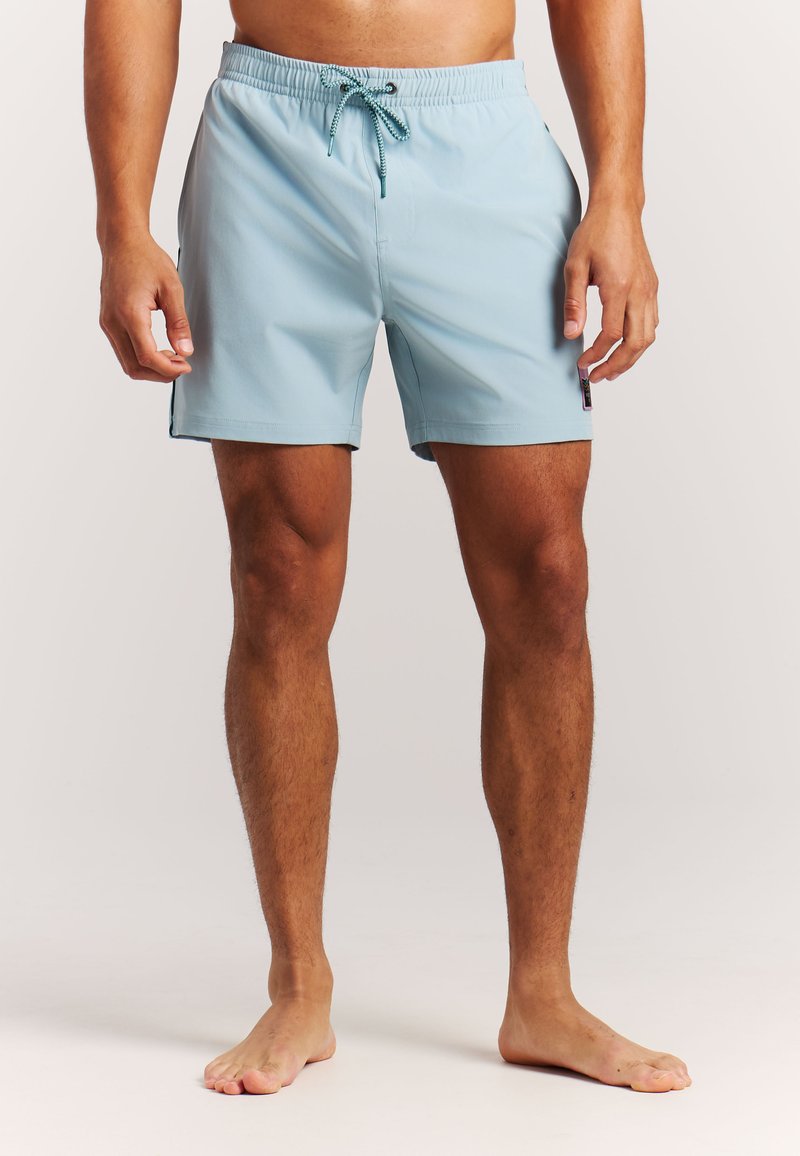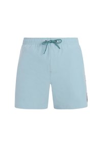 Lichtblauwe zwembroek met een elastische tailleband en trekkoord. Gemaakt van gladde stof met zijzakken en een klein logolabel.