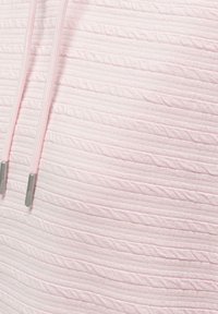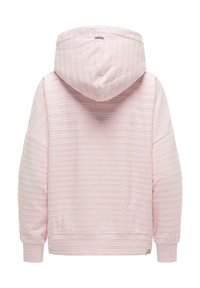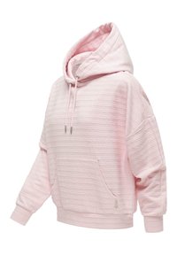 Lichtroze textuurige pullover hoodie met voorzak en capuchon met trekkoord, afgebeeld op een effen witte achtergrond.