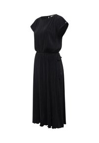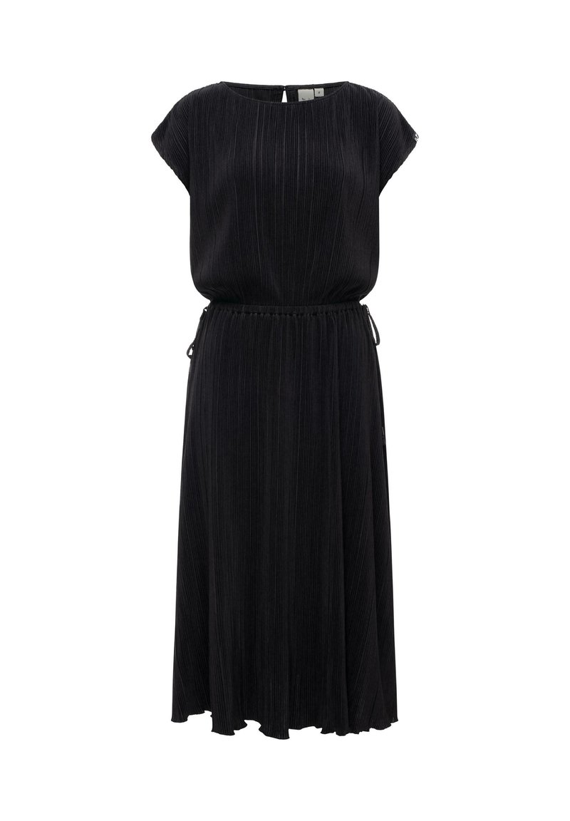 Zwart midijurk met korte mouwen, geplooide stof, getailleerde taille en ronde halslijn met een kleine knoopsluiting aan de achterkant.