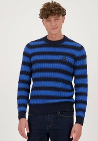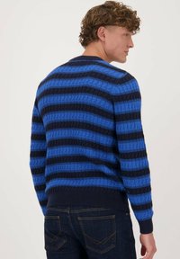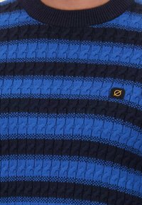 Blauwe en marine gestreepte trui in gebreide textuur, met een geribde kraag en zoom, met een klein logo detail op de borst.