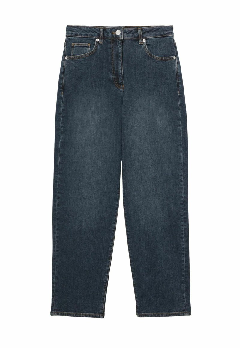 Donkerblauwe jeans met hoge taille en rechte pijpen, voorzien van een knoopsluiting aan de voorkant, rits en een ontwerp met vijf zakken op een witte achtergrond.