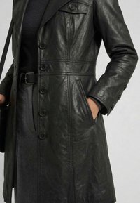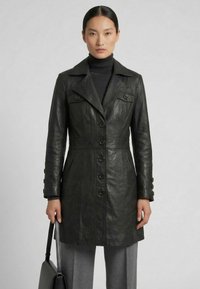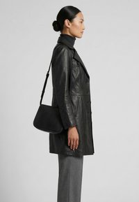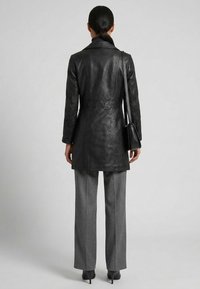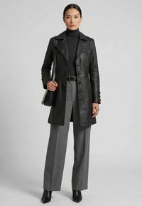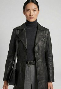 Vrouw draagt een zwarte leren jas met knopen over een zwarte coltrui, grijze broek, houdt een zwarte handtas tegen een effen achtergrond.