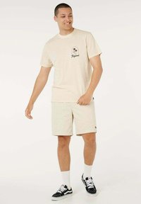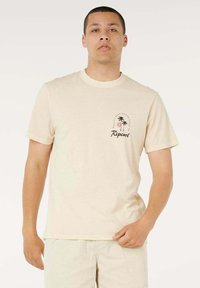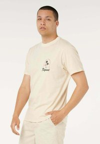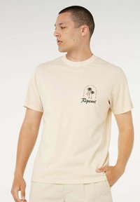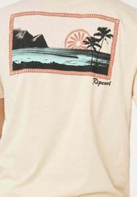 Crèmekleurig katoenen t-shirt met een grafische print op de achterkant van bergen, een zon en palmbomen in zwarte, blauwe en rode accenten.