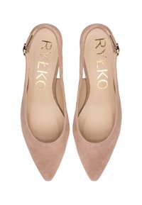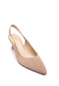 Benedenlichaam met donkerblauwe spijkerbroek en beige suède slingback kittenhakken, staand op een witte achtergrond.