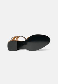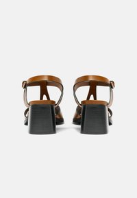 Bruine leren sandaal met open teen, uitsnijdingen, enkelriem met gesp en zwarte blokhak.