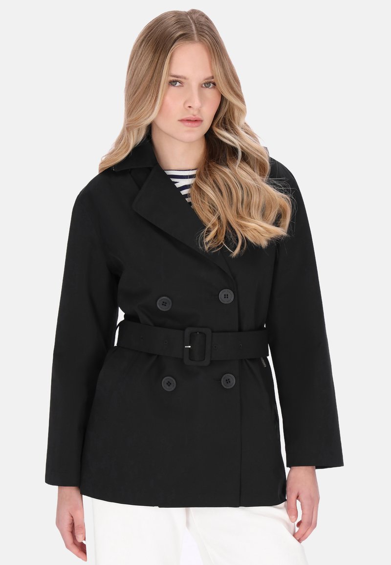 Zwarte dubbelgeknoopte trenchcoat met een tailleceintuur, voorzien van grote knopen en een klassieke kraag, gedragen over een gestreept shirt.