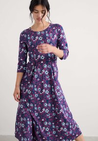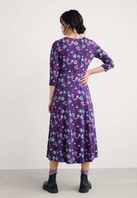 Paarse bloemenjurk met driekwartmouwen en een getailleerd lijfje, voorzien van een uitlopende rok. Gecombineerd met zwarte enkellaarsjes en paarse sokken.